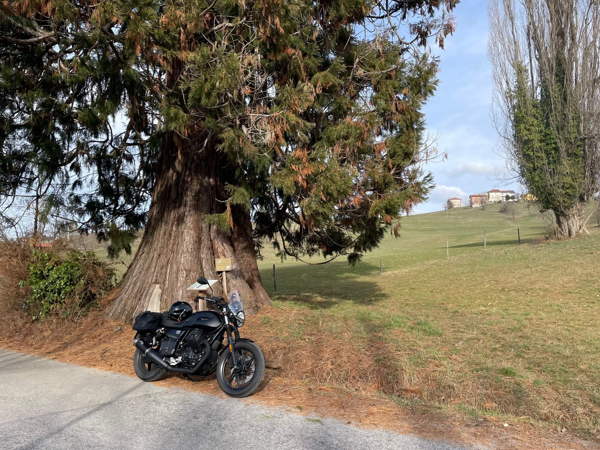 Its story is now the stuff of legend: the story goes that in the 18th century, a Spanish princess was travelling accompanied by a hundred strapping knights, and when a storm broke out, they took shelter under the branches of this vast tree, giving rise to its name. And to think that if it happened today, perhaps there would be fifty or a hundred motorcyclists, and a film star, model, or even just a friendly baker instead of the princess. What does it matter to us? No longer horses, however majestic, but shiny, roaring motorcycles, Moto Guzzis, perhaps...