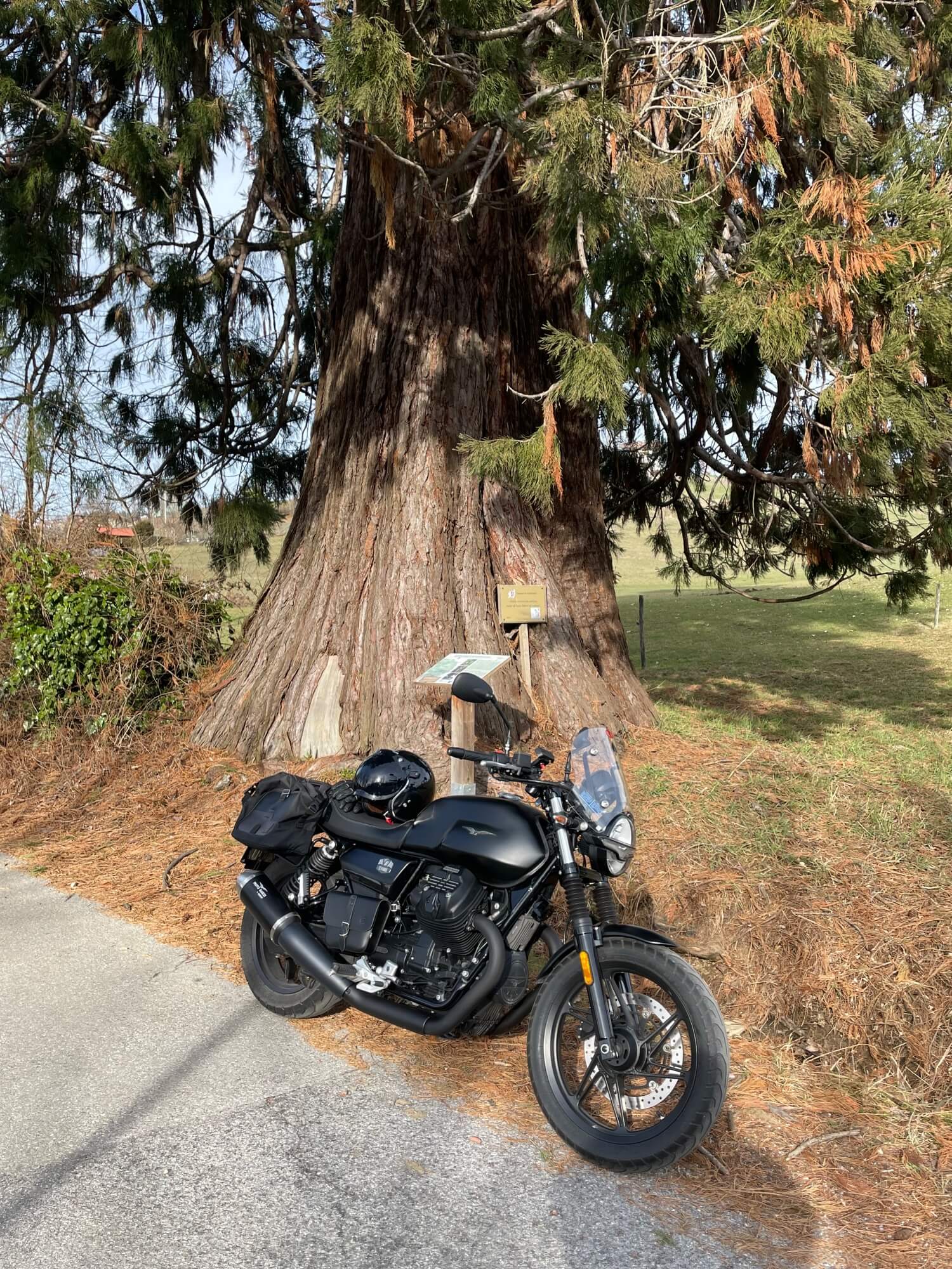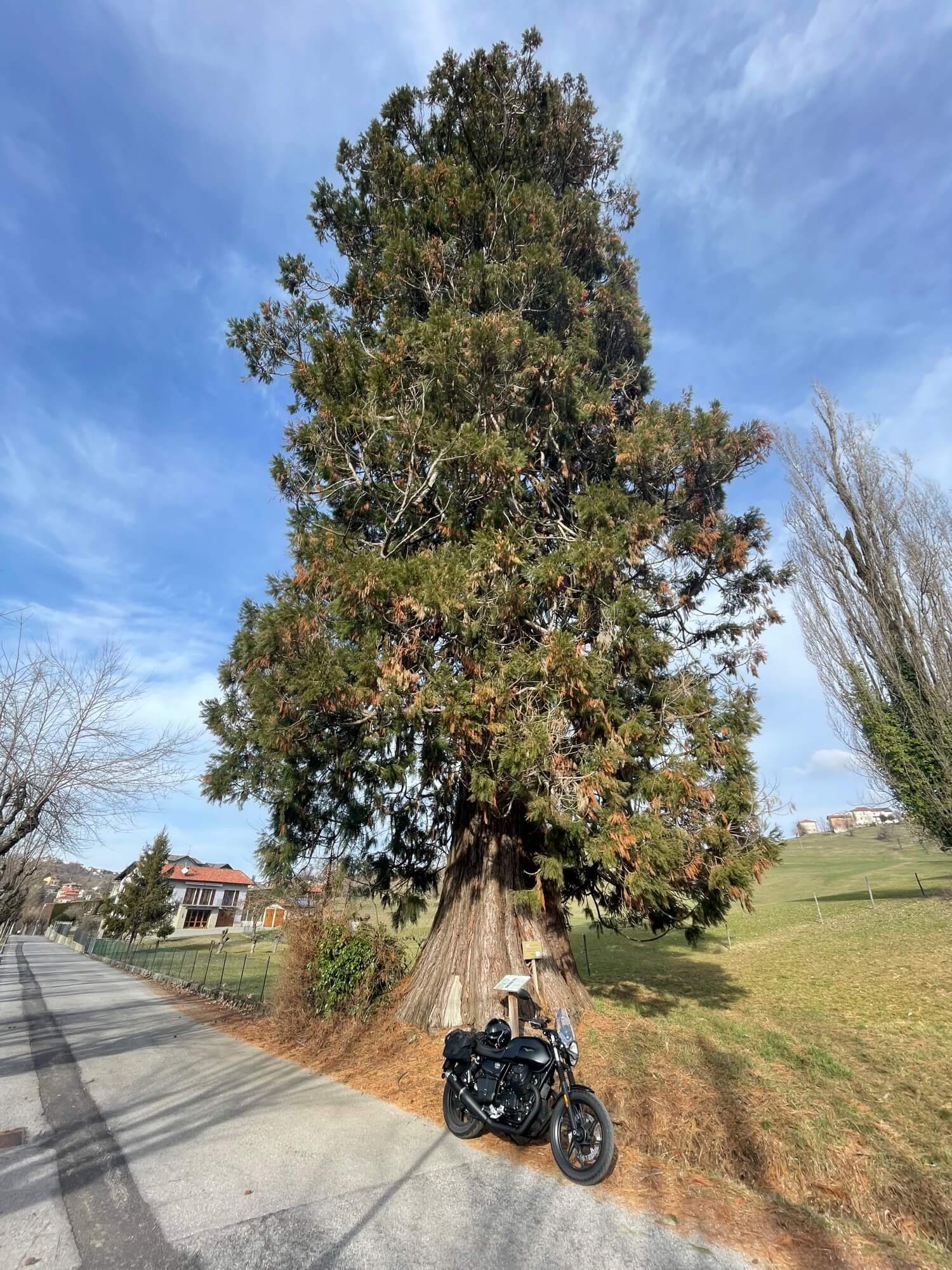 Sequoia tree in Vicoforte (Mondovì, Piedmont) and Moto Guzzi V7 Stone.